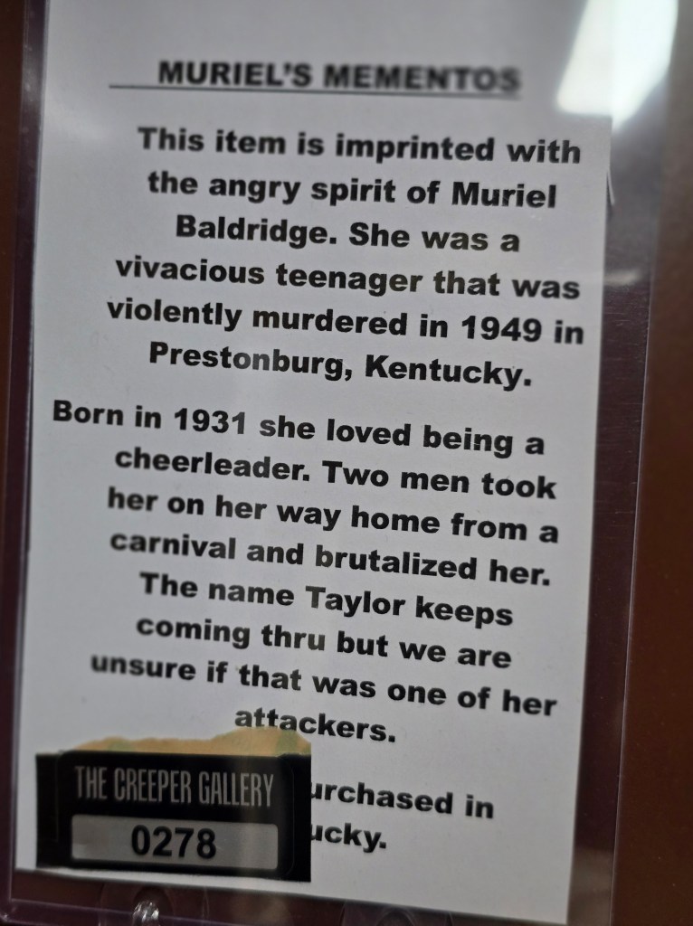 Muriel’s spirit is restless, angry, and confused. I picked up the sound of her bronze shoes hitting the floor. I hear her screams, and heartbreaking pleas to a man named Ortho. He took what he wanted, without any guilt. I have to tell you this impression left me feeling sick and nauseated.