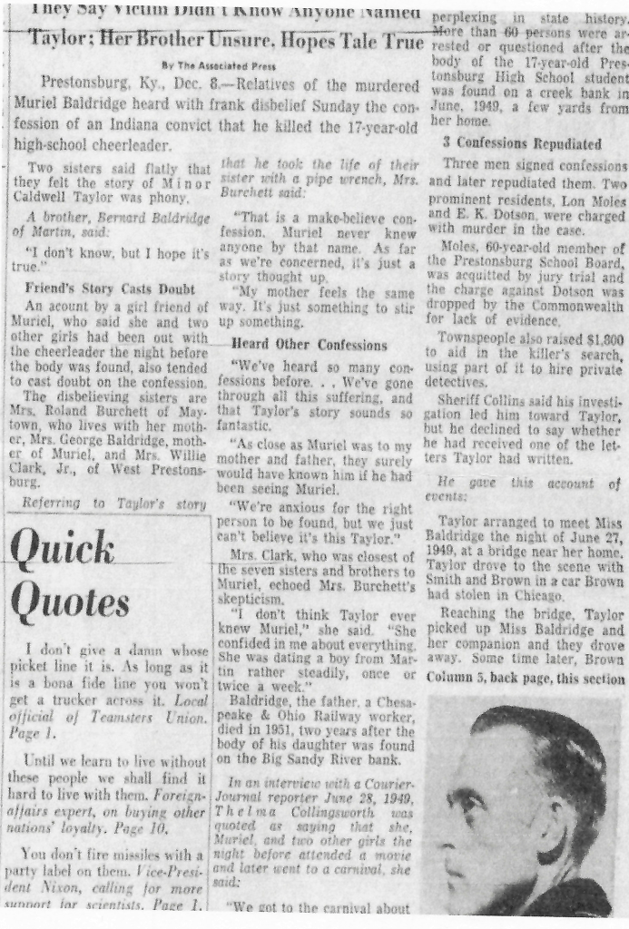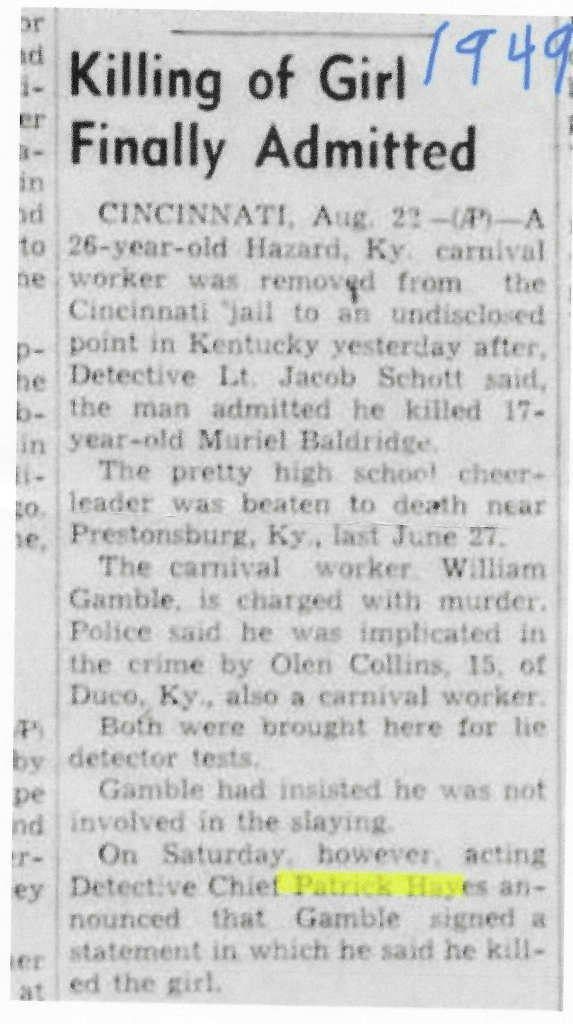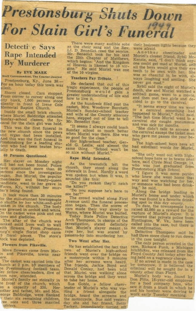 On June 27, 1949 Muriel went out with friends, first to the movies, and later to the carnival. Afterwards the girls walked home together and they parted ways at the historic West Prestonburg Bridge. One of her friends offered to walk her the rest of the way home, but Muriel had never been afraid to cross the bridge alone.
