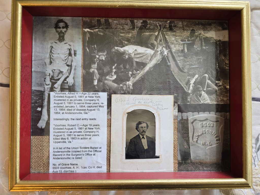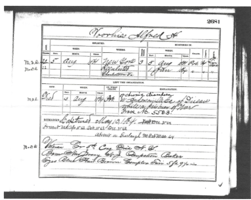 For 158 years, Alfred H. Vorhies has been waiting to tell his story, and ever since I saw his face, I have been unable to think of anything else. Handwritten at the top of the photograph, taken of Alfred before he enlisted, is the following: “Alfred Vorhies-starved to death in Libby Prison.” But Alfred was NOT in Libby Prison in Richmond, Virginia-instead he was imprisoned in Macon, Georgia in Andersonville Prison. The prison was a stockade, which was terribly overcrowde_d. At one time, there were as many as 26,000 prisoners there in a space intended for only 10,000. Most prisoners were without shelter, and there simply was not enough food to feed them. Or, when they had fresh meat, there was no wood to cook it. Alfred starved to death over the course of the next three months. In Alfred’s words, written on July 3, 1864, “This is no other than a place of Starvation, a disgrace to any Government.” Alfred’s family did not know where he was. On July 17, 1864, still hopeful about going home, he wrote, “This has been a very pleasant and cool day, the Wind blew cool and Refreshing. had a lovely days Rations and a fine supper, com bread and Molasses, good food…it for a soldier. guess ifl was home don’t think I would eat such food, how I do wish I was home tonight, how happy I would be, how would Sister feel if she knew how and where I was. God forbid She should know it, till I get out of this.” Alfred never returned home and never saw his sister again. He died less than a month later.