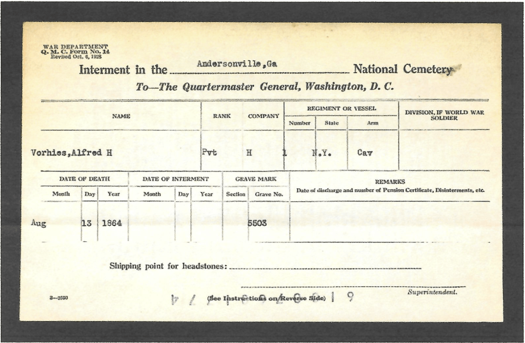 1864 Diary of Alfred H. Voorhees, from the time he was taken pris[o]ner until! 9 days before his death at Andersonville, Ga., which occurd August 13th,1864.” (Transcribed by Alfred’s Sister Rebecca)