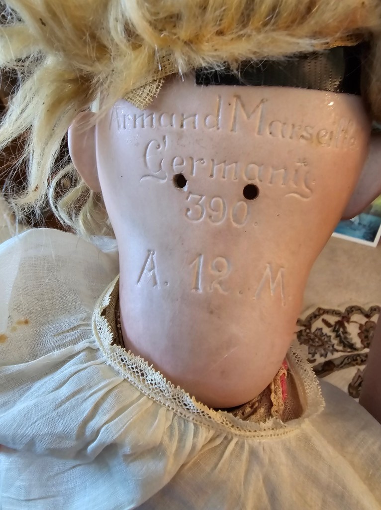 Doretta Wendt Schutt was born in the Mecklenburg region in Northern Germany in 1840. She emigrated to America and made her way to Springfield, Illinois about a hundred miles from where I live. Doretta, often called “Dora,” married Charles Schutt, also from Mecklenburg, in 1860. I feel they knew each other in Germany. They started a family and made their way to Nebraska. This German doll was manufactured between the 1860s and the l 880s. Doretta may not have played with this doll as a child, but her daughters most certainly did.