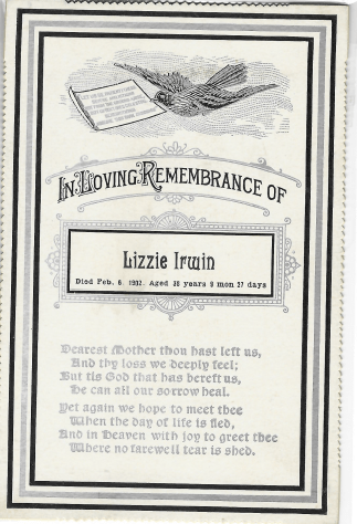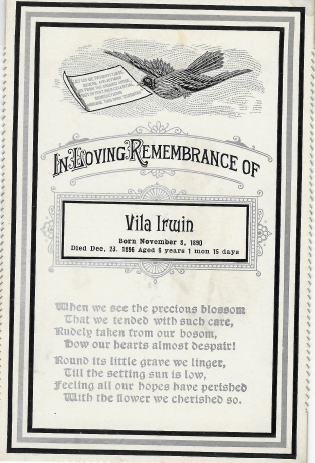 Vila Irwin was a little girl with a very short life, but she was the shining star of the Irwin family and the community. Her mother, Elizabeth was born in Wales and Vila was named after her grandmother or another close relative of her mother’s. Elizabeth and her husband Robert were pioneers and they moved cross country to a place call Zillah, Washington.